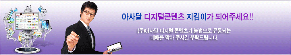 디자인 콘텐츠 제작 및 유통사인 (주)아사달은 디지털 콘텐츠의 불법적인 유통으로 인해 막대한 피해를 입고 있습니다. 아사달의 디자인 콘텐츠를 불법으로 유포하는 상습적 불법파일 유포 네티즌들을 신고하는 네티즌들에게는 신고물에 대한 사실유무 확인 후 소정의 사례품을 드립니다. 적극적인 신고를 통해 많은 시간과 노력을 통해 만들어진 디지털 콘텐츠가 불법으로 유통되는 폐해를 막아 주시길 간곡히 부탁드립니다. |